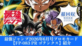 今回は2026年発売の【最強ジャンプ6月号】に付いてくるドラゴンボールフュージョンワールドの『マンガブースター02』に収録されているリーダーゴテンクスデッキで超強力に使えるPR(プロモカード)『FP-083 PR ゴテンクス』を紹介していきます!
