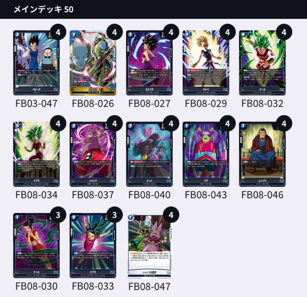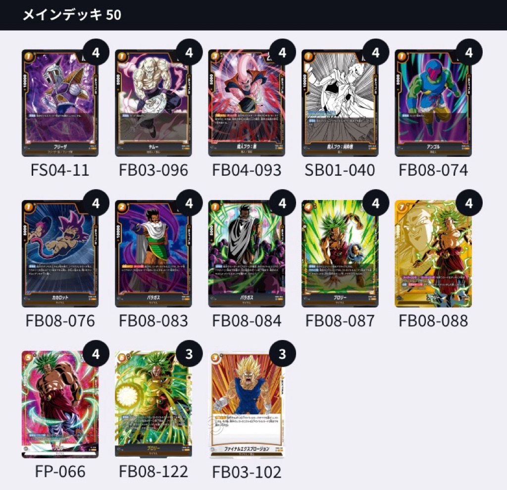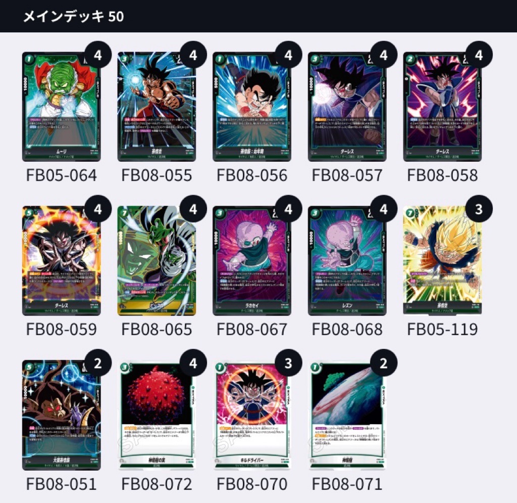 この超速アグロを支えるリーダー効果を最速発動可能とする1コスト自傷の超絶優秀カードFB08-019 R(★) ビーデルを筆頭に多数の超優秀な自傷カードが配られているのも安定して強い要因の1つとなっています。