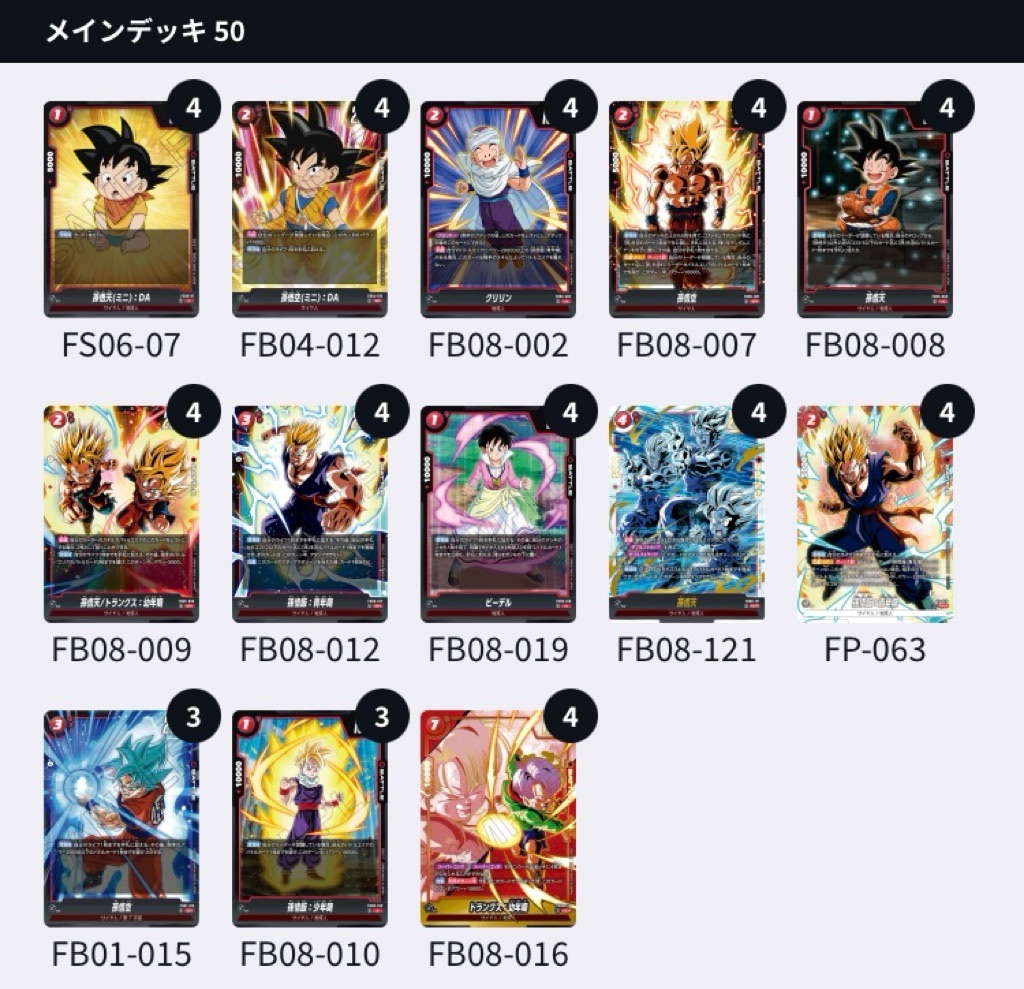 他にもFB08-008 UC 孫悟天でドロップから上記のような主要なコスト3以下カードを拾えたり、FB08-010 C 孫悟飯:少年期でマルカリータと同じ動きを行えるのも最速アグロ攻めを支えている1部となっています。