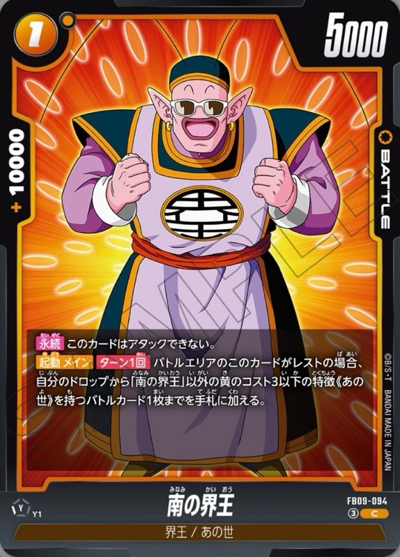 【起動 メイン】【ターン1回】バトルエリアのこのカードがレストの場合、自分のドロップから「南の界王」以外の黄のコスト3以下の特徴《あの世》を持つバトルカード1枚までを手札に加える。
