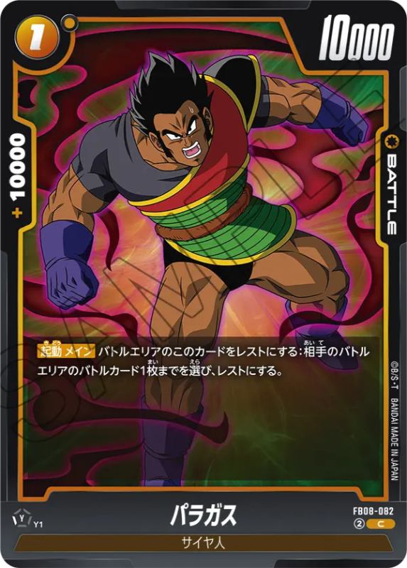 アクティブになった1コストで『FB08-084 SR(★) パラガス』を登場させれば、リーダー黄ブロリーの相手ターン中に発動する覚醒後効果を使うこともでき、尚且つ次のターンまで生き残りやすくなります♪