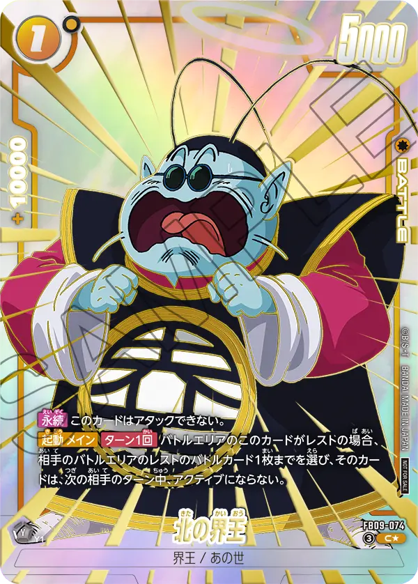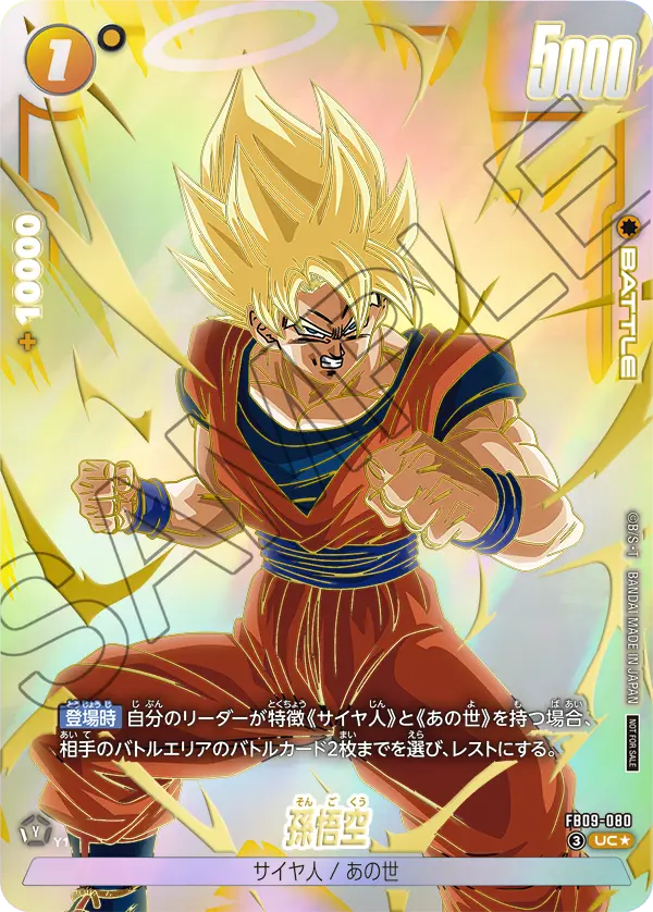 【登場時】自分のリーダーが特徴《サイヤ人》と《あの世》を持つ場合、自分のライフ1枚までを手札に加える。その後、相手のバトルエリアのレストのコスト1以下のバトルカード1枚までを選び、KOする。