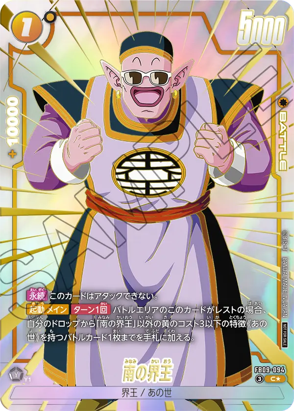 【起動 メイン】【ターン1回】バトルエリアのこのカードがレストの場合、自分のドロップから「南の界王」以外の黄のコスト3以下の特徴《あの世》を持つバトルカード1枚までを手札に加える。