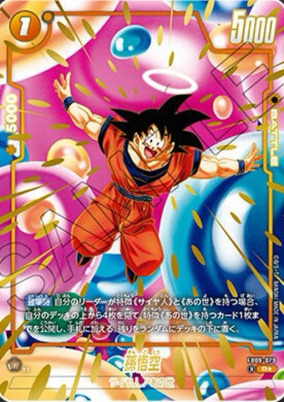 【登場時】自分のリーダーが特徴《サイヤ人》と《あの世》を持つ場合、自分のデッキの上から4枚を見て、特徴《あの世》を持つカード1枚までを公開し、手札に加える。残りをランダムにデッキの下に置く。