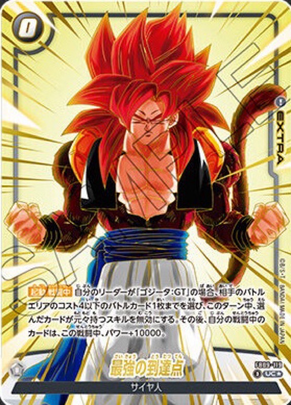 【起動 戦闘中】自分のリーダーが「ゴジータ:GT」の場合、相手のバトルエリアのコスト4以下のバトルカード1枚までを選び、このターン中、選んだカードが元々持つスキルを無効にする。その後、自分の戦闘中のカードは、この戦闘中、パワー+10000。