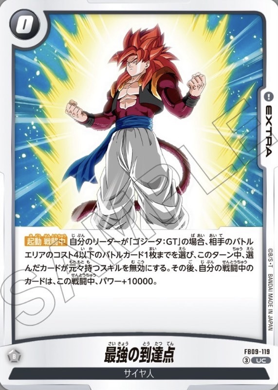 【起動 戦闘中】自分のリーダーが「ゴジータ:GT」の場合、相手のバトルエリアのコスト4以下のバトルカード1枚までを選び、このターン中、選んだカードが元々持つスキルを無効にする。その後、自分の戦闘中のカードは、この戦闘中、パワー+10000。