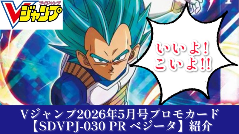 今回は2026年発売の【Vジャンプ5月特大号】に付いてくるドラゴンボールスーパーダイバーズのPR(プロモカード)『SDVPJ-030 PR ベジータ』を紹介して行きます!
