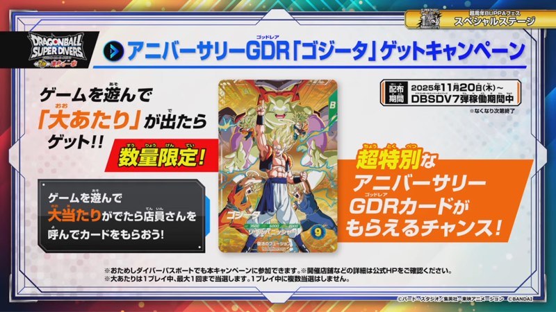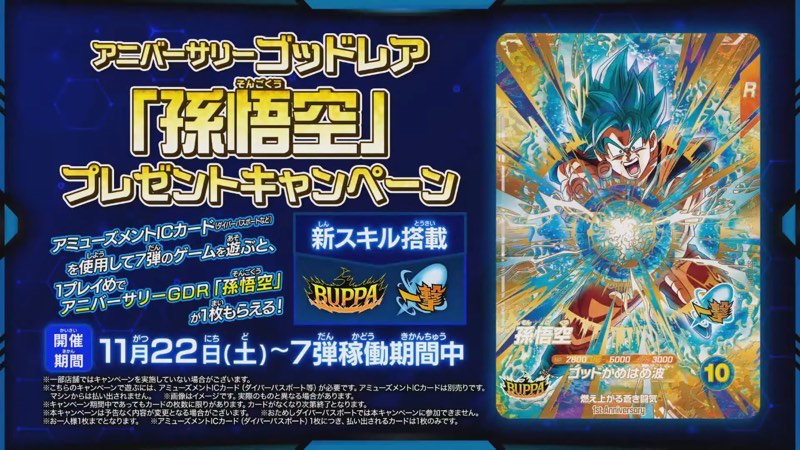 開催期間中にDBSDV7弾 渾身の一撃をプレイすると、1プレイ目のプレイ終了時にアニバーサリーゴッドレアカードをプレゼント。