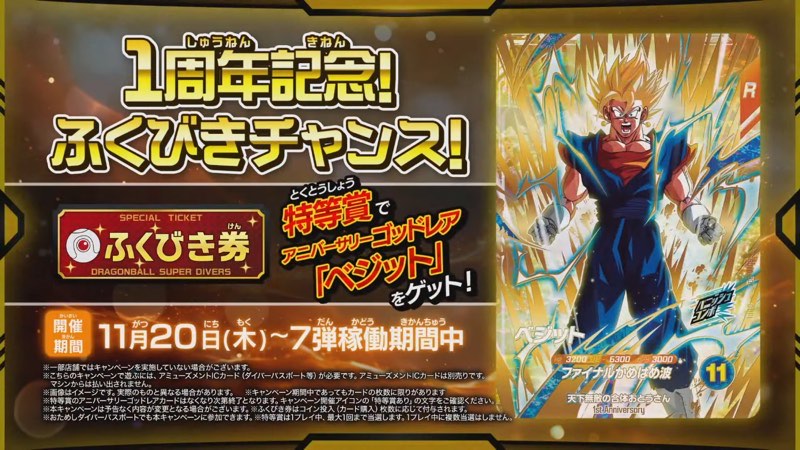 6弾と7弾で集めたふくびき券で1周年記念!ふくびきチャンス!にチャレンジして、特等賞を当てればアニバーサリーゴッドレアのベジットをプレゼント。