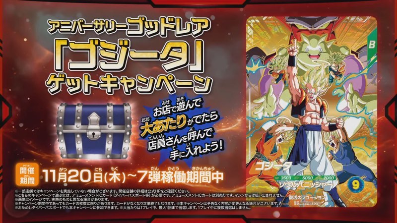 ゲーム後に100円を入れた回数分宝箱の抽選があり宝箱から『大当たり』が出ると「お店の人を呼んでね」と表示されるので、店員を呼ぶと1周年記念宝箱ゴジータGDRが入手できる。