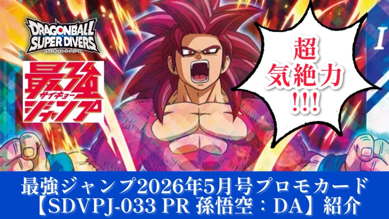 今回は2026年発売の【最強ジャンプ5月号】に付いてくるドラゴンボールスーパーダイバーズで使えるPR(プロモカード)『SDVPJ-033 PR 孫悟空:DA』を紹介していきます!