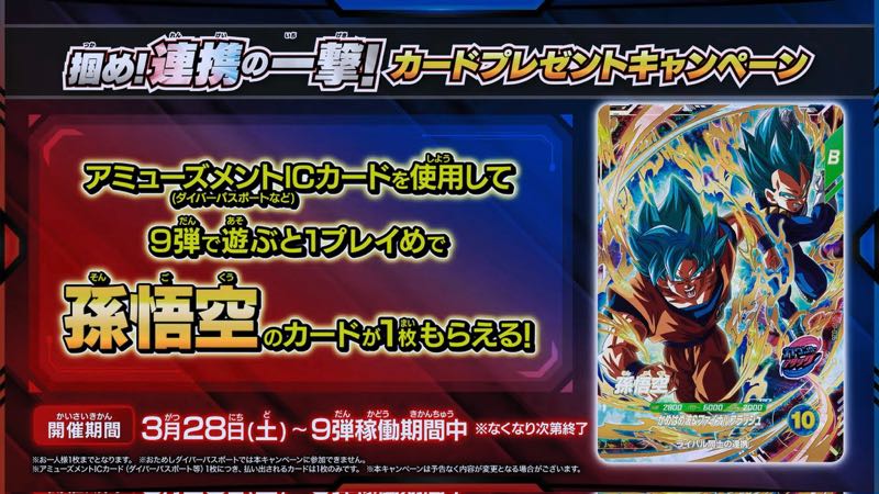 開催期間中にDBSDV9弾 連携の一撃をプレイすると、1プレイ目のプレイ終了時に連携の一撃キャンペーンカードをプレゼント。
