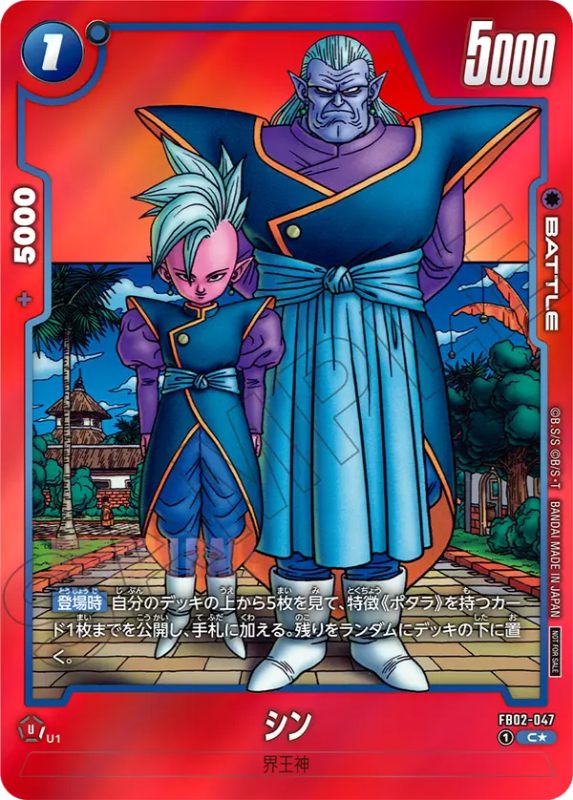 【登場時】自分のデッキの上から5枚を見て、特徴《ポタラ》を持つカード1枚までを公開し、手札に加える。残りをランダムにデッキの下に置く。