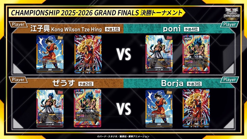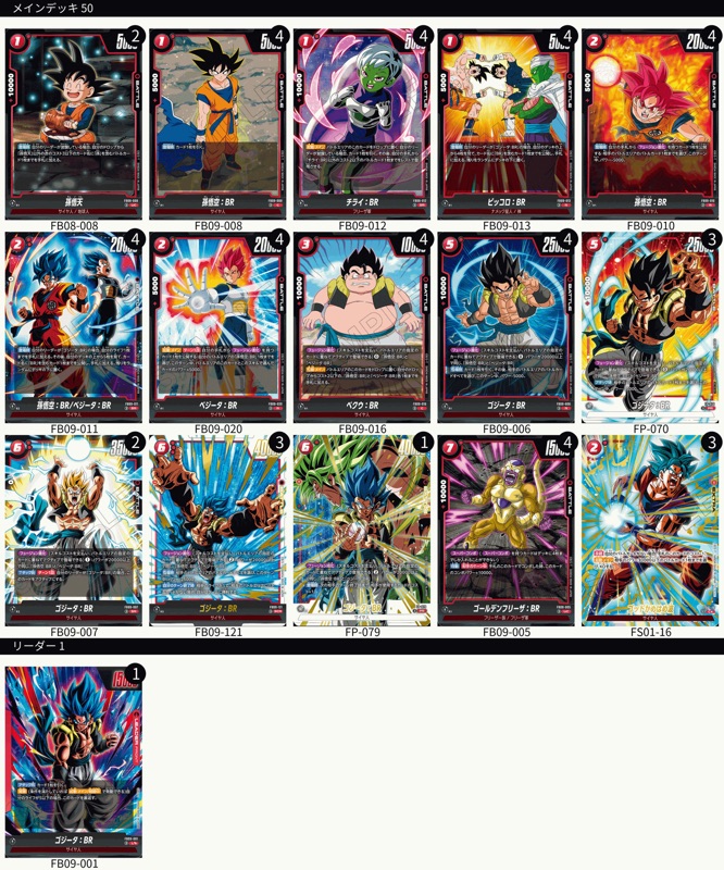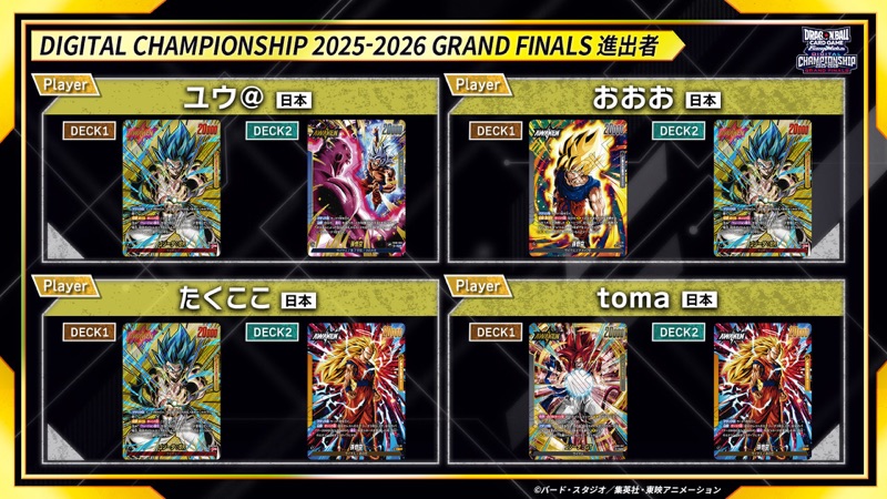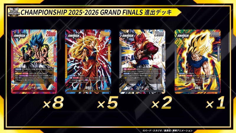デジタル版の2025-2026ファイナルズは以下の通り『FB09-001 L(★/★★) ゴジータ:BR』『FB09-025 L(★/★★) 孫悟空』『FS11-01 L(★) 孫悟空』『FS12-01 L(★) 孫悟空』『FB09-097 L(★) ゴジータ:GT』の5種リーダーが進出。