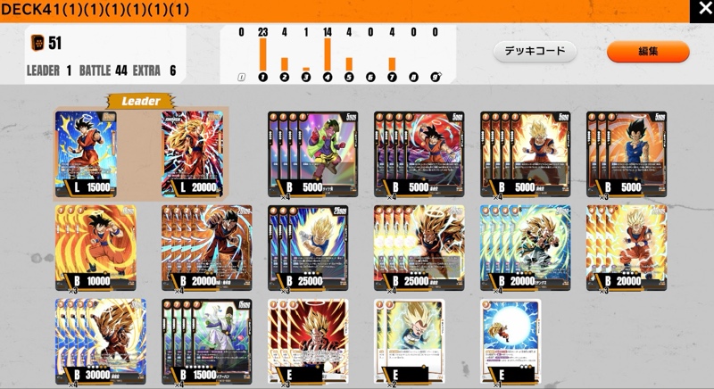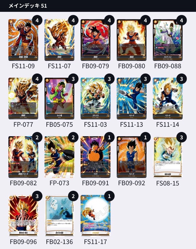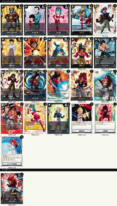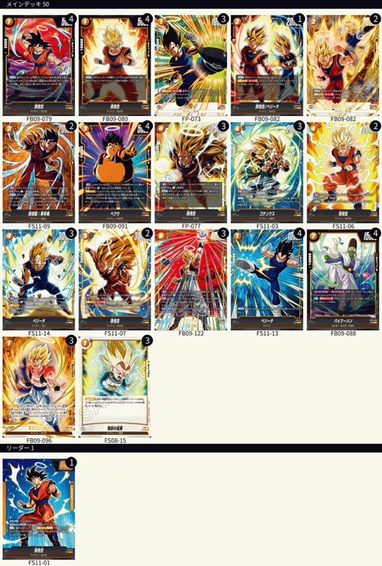 エクストラの配分は【Borja選手】をリスペクトしてそのままにしており、後は魔ベジを不採用にして『FB09-093 R(★) ベジータ』を入れてコンボ値をマシマシにしたり、ゴクベジを不採用にして『FS11-06 C(★) 孫悟空』を採用してドロソ系を増やしたりと、とにかく使いやすい形に変えました。